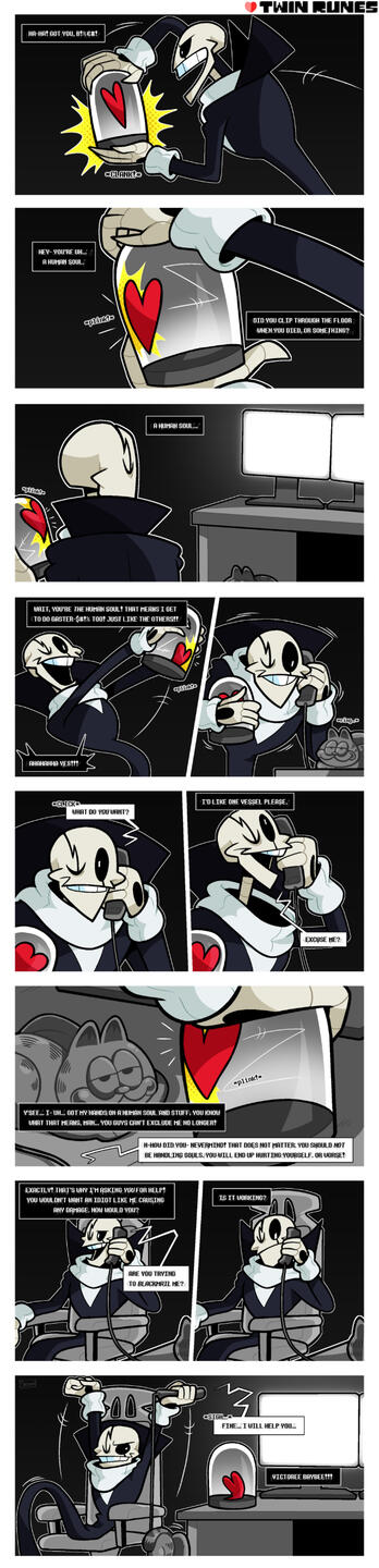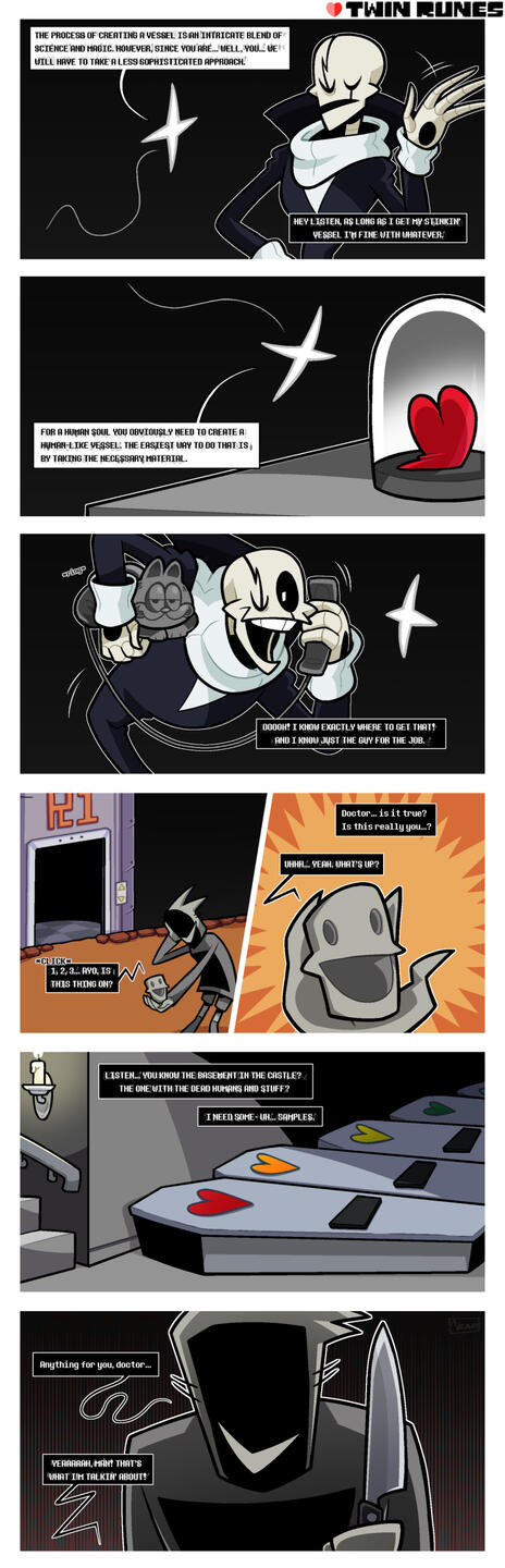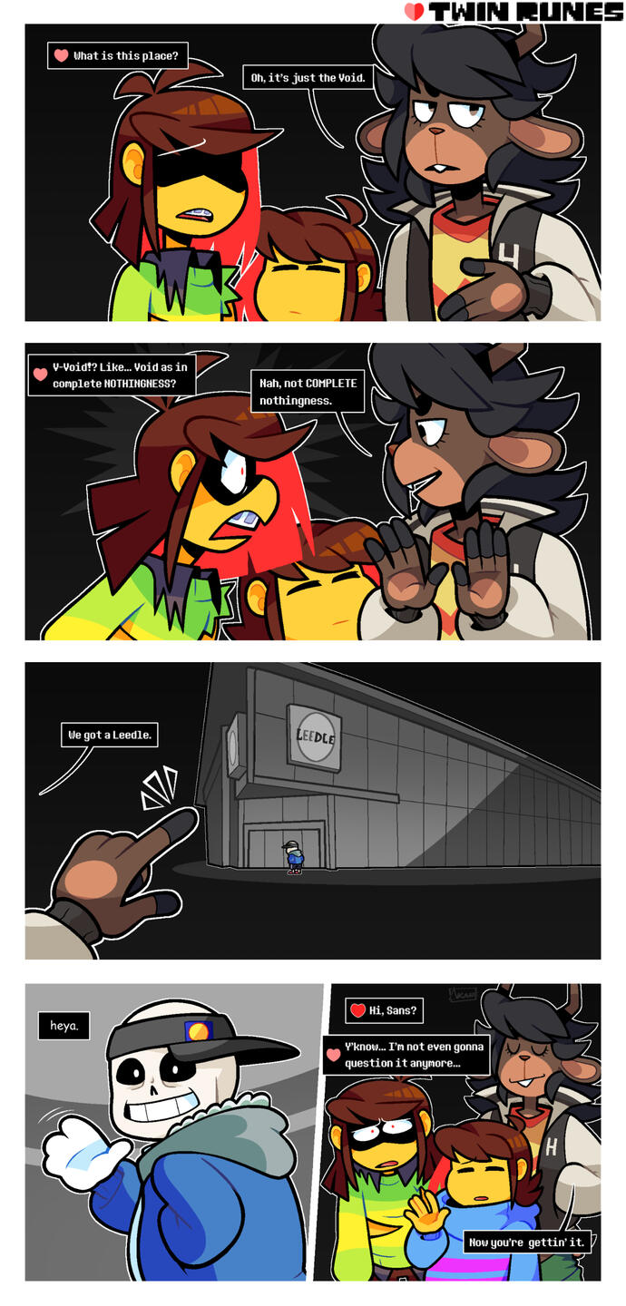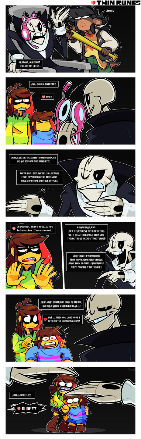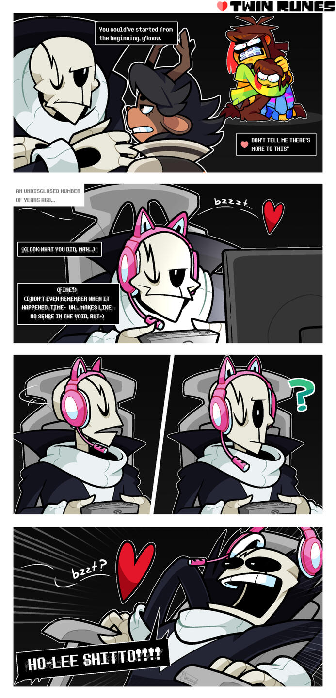 Twin Runes is a mostly lighthearted comic AU centered on the Deltarune and Undertale Universe.An unknown force has caused a connection point between the two universes to appear, making Frisk and their ghost nuisance Chara stumble into Kris' life on one of their many resets (much to Kris' displeasure).